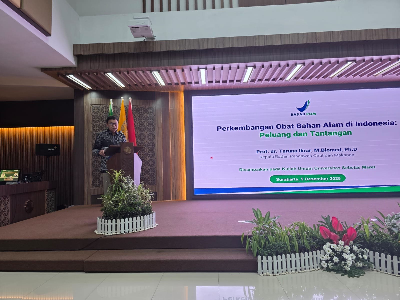Solo — Kepala Badan Pengawas Obat dan Makanan (BPOM) RI, Prof. dr. Taruna Ikrar, M.Biomed., Ph.D., disambut meriah oleh Rektor Universitas Sebelas Maret (UNS) Solo, Prof. Dr. Hartono, dr., M.Si., bersama jajaran guru besar, dosen, dan ratusan mahasiswa Fakultas Kedokteran dalam kuliah umum bertema sejarah kedokteran Nusantara dan masa depan regulasi kesehatan Indonesia. Forum akademik yang berlangsung hangat dan penuh antusiasme itu berubah menjadi momen istimewa ketika Taruna menyampaikan dua kabar besar bagi dunia ilmu pengetahuan dan bangsa. jumat 5 desember 2025.