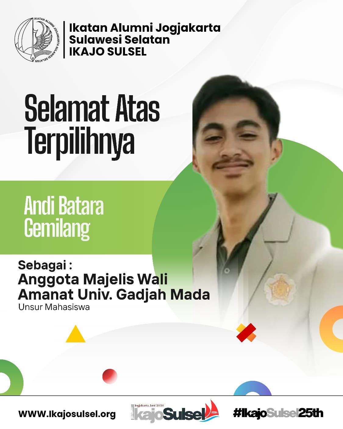 Jogjakarta,- katan Alumni Jogjakarta Sulawesi Selatan (IKAJO SULSEL) menyampaikan apresiasi atas terpilihnya Andi Batara Gemilang sebagai Anggota Majelis Wali Amanat (MWA) Universitas Gadjah Mada (UGM) periode 2026–2031 dari unsur mahasiswa.