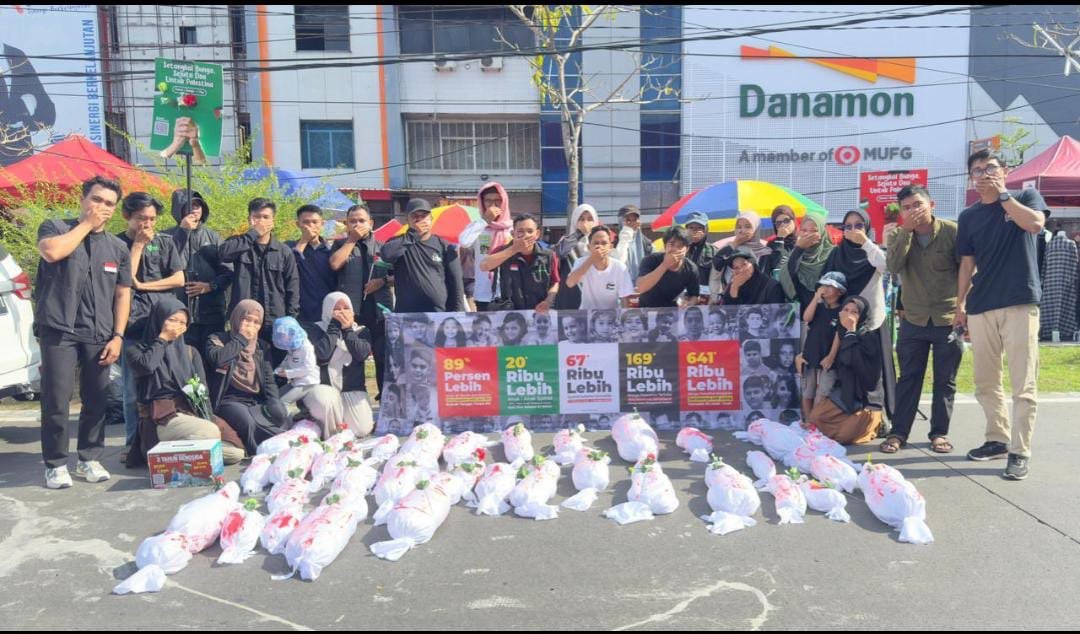 Aksi damai tersebut juga dirangkaikan dengan long march dan peragaan simbolis mayat sebagai bentuk protes terhadap kekejaman Israel yang telah merenggut banyak nyawa tak berdosa.