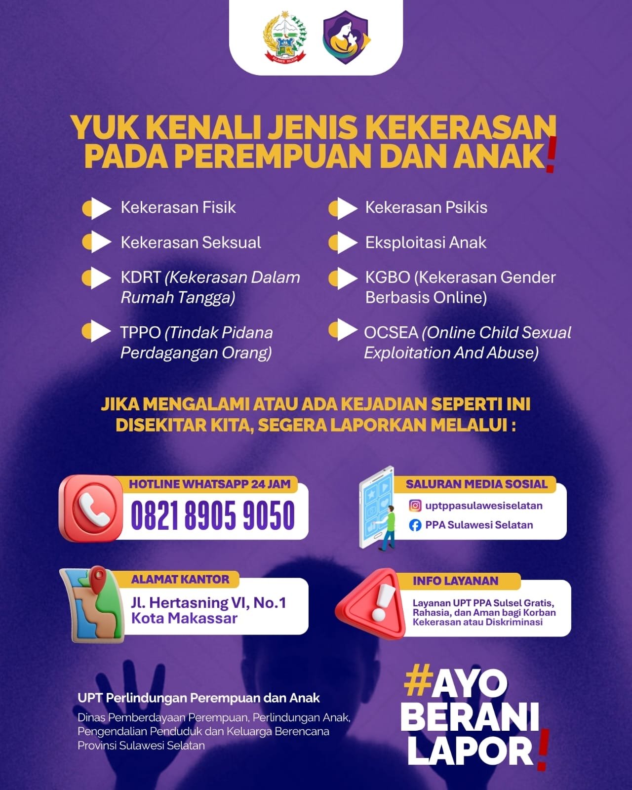 Pemprov Sulsel melalui DP3A Dalduk dan KB terus mendorong masyarakat untuk tidak ragu melaporkan kekerasan terhadap perempuan dan anak. Laporan dapat disampaikan melalui Unit Pelaksana Teknis Perlindungan Perempuan dan Anak (UPT PPA) guna memastikan korban mendapatkan penanganan yang tepat dan komprehensif.