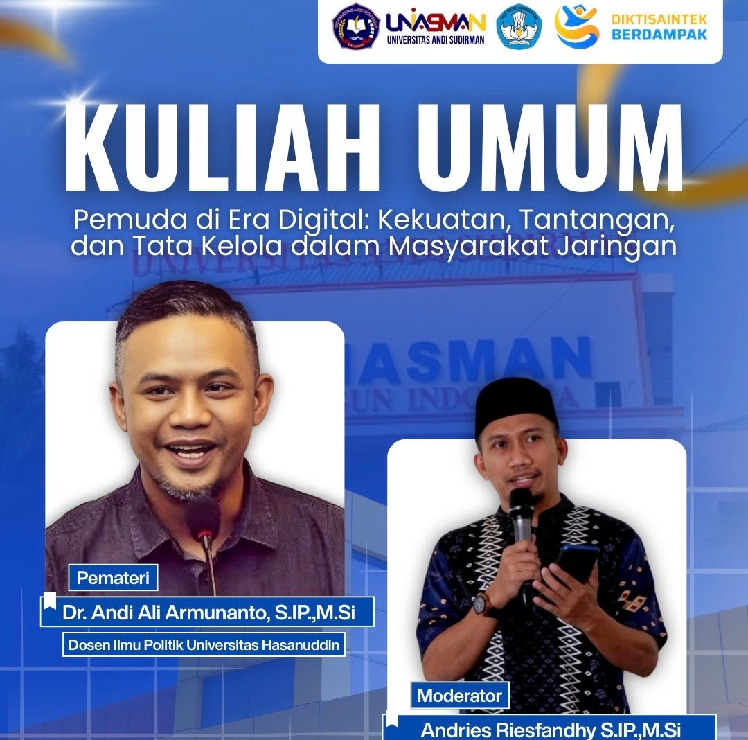 Makassar, 15 Desember 2025 – Universitas Andi Sudirman (UNIASMA) hari ini menyelenggarakan Kuliah Umum dengan tema “Pemuda di Era Digital: Kekuatan, Tantangan, dan Tata Kelola dalam Masyarakat Jaringan.” Acara yang bertujuan untuk membangkitkan kesadaran politik dan peran pemuda di era digital ini, digelar di Aula Universitas Andi Sudirman.