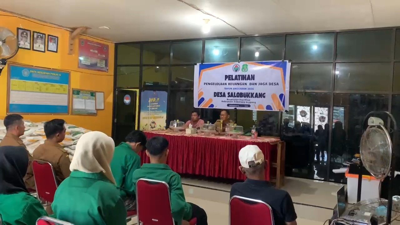 Salobukkang, 28 April 2026 — Pemerintah Desa Salobukkang, Kecamatan Dua Pitue, Kabupaten Sidenreng Rappang, melaksanakan kegiatan Pelatihan Pengelolaan Keuangan dan Jaga Desa Tahun Anggaran 2026 yang bertempat di Aula Kantor Desa Salobukkang pada Selasa (28/04).