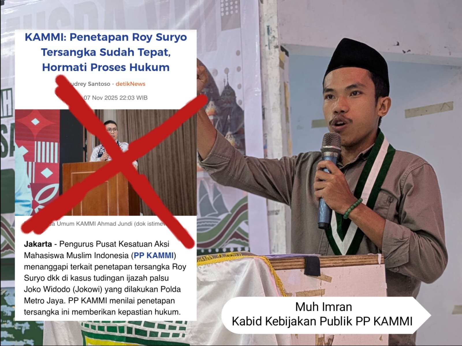 Jakarta, 9 November 2025 – Pengurus Pusat Kesatuan Aksi Mahasiswa Muslim Indonesia (PP KAMMI) secara tegas membantah pernyataan yang mengatasnamakan organisasi terkait penetapan Roy Suryo sebagai tersangka. Bantahan ini disampaikan melalui Bidang Kebijakan Publik PP KAMMI sebagai respons terhadap pemberitaan di sejumlah media massa yang mencantumkan nama KAMMI dalam pernyataan dukungan terhadap penetapan tersebut.