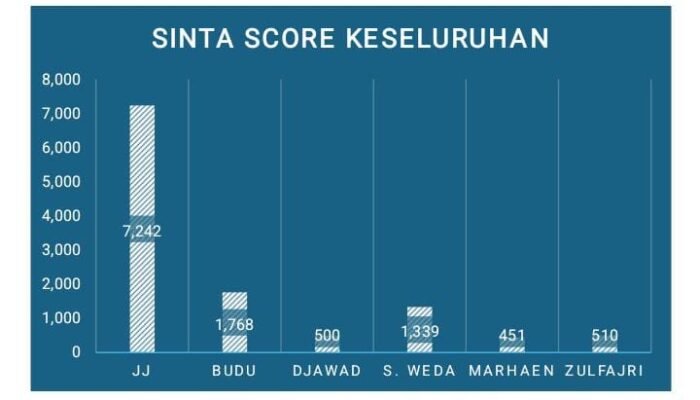 Data SINTA Score keseluruhan menunjukkan bahwa Prof. JJ mencatat angka 7.242, lagi-lagi tertinggi di antara para bakal calon Rektor lain.