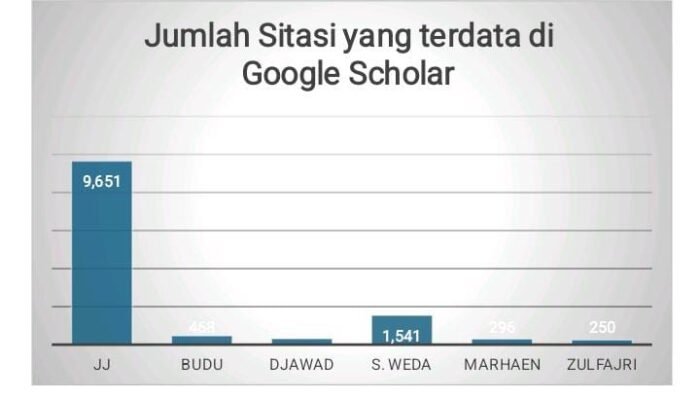 Begitu juga capaian sitasi sebagai dicatat oleh Google Scholar. Prof. JJ mencapai angka 9.651. Sementara di peringkat kedua, yaitu Prof. Sukardi Weda hanya berada di angka 1.541. Figur-figur lainnya berada di bawah angka 500, sebagaimana dapat dilihat pada grafik berikut: