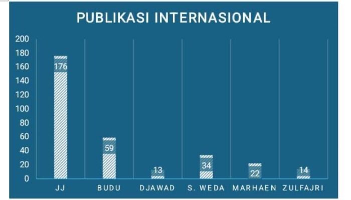 Dilihat dari indikator jumlah publikasi internasional bereputasi (sebagaimana tercatat pada Scopus). Prof. JJ memiliki 176 publikasi. Di urutan kedua, Prof. Budu dengan capaian tidak sampai sepertiga, yaitu 59 publikasi internasional.